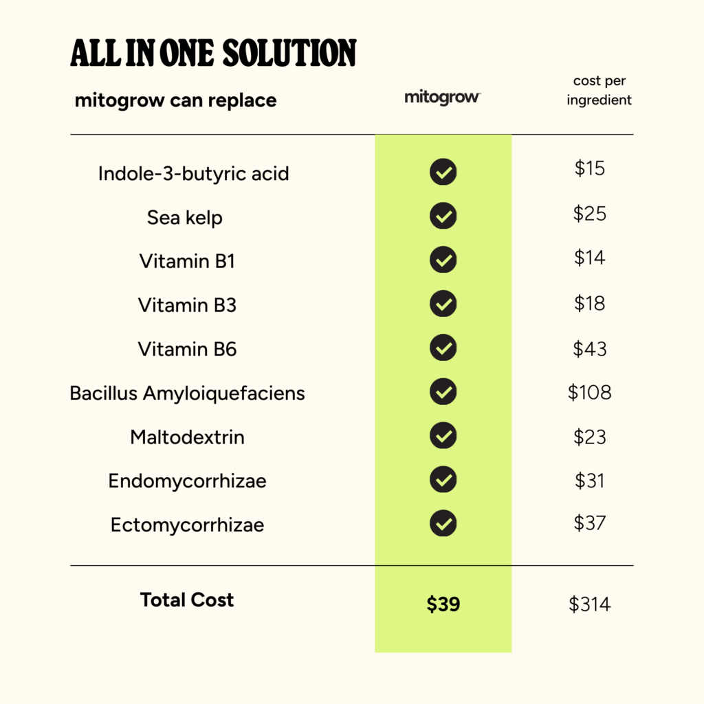 Powered by a patented blend of plant growth regulators, B vitamins, and beneficial microbes—including mycorrhizal fungi—mitogrow enhances the natural biological processes that drive plant performance from the inside out. This allows plants to make more efficient use of available nutrients without increasing fertilizer inputs.